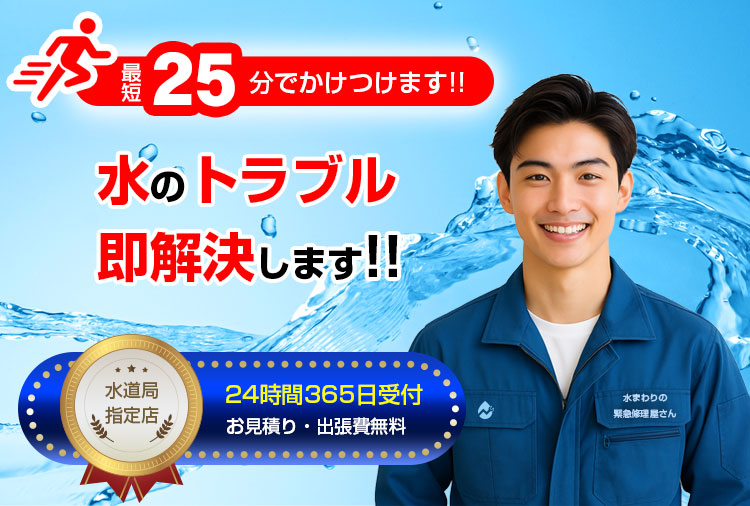 トイレや蛇口、排水管など様々な場所の水トラブルを24時間365日いつでも解決いたします。